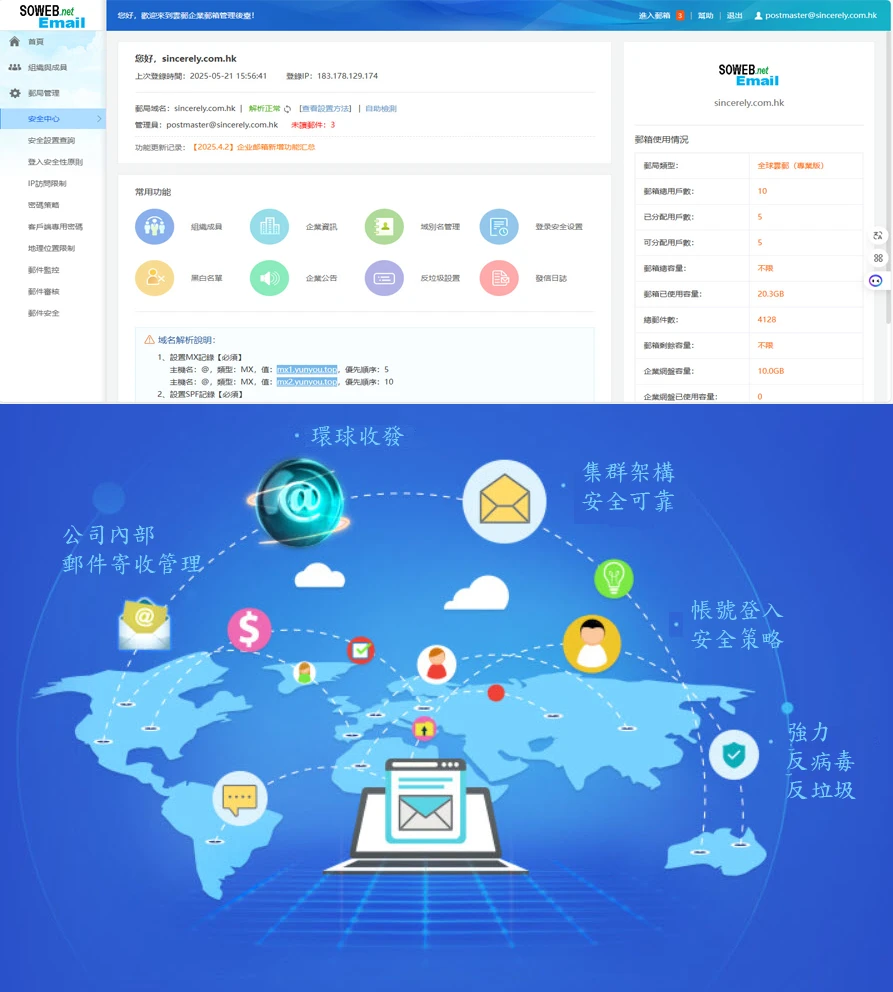 免費域名(.com、.net、.biz, .info, .hk、.cn或.tw)註冊30 個專業電郵帳戶,無限儲存空間,滿足公司業務運作需求支持電郵監控及IP登入限制等進階功能支持 POP3/SMTP/IMAP 客戶端收發,超大附件發送。雲端硬碟儲存超大檔案,電郵分享鏈結。免費技術支援及問題追蹤系統,包括系統初始設置的上門指導